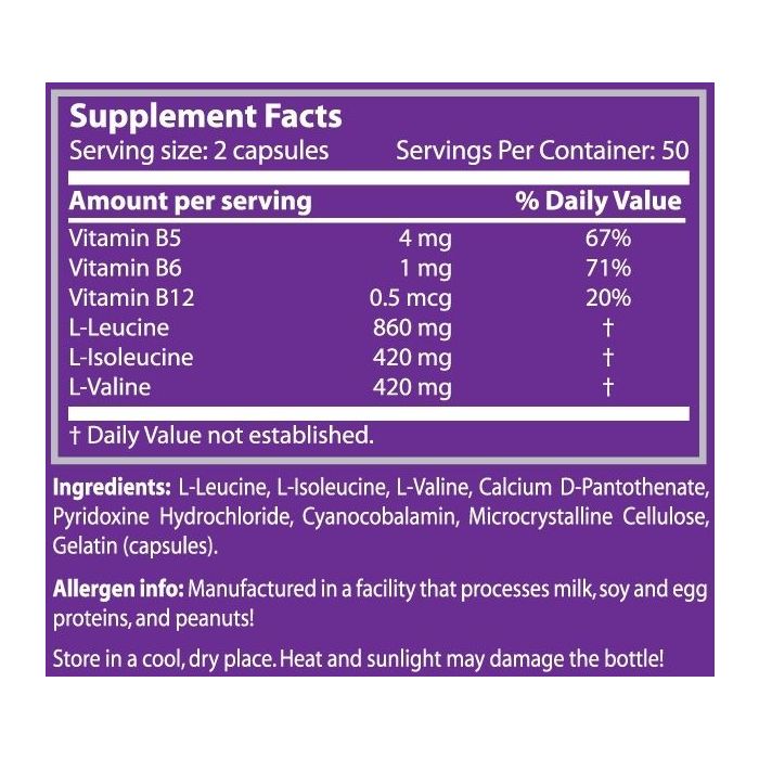 A BCAA 1000 aminosavak elágazó láncú aminosavakat tartalmaznak (BCAA-k), név szerint a leucin, az izoleucin és a valin, az izomtömeg építése és a regeneráció elősegítése érdekében. Egy kapszulában 1000 mg esszenciális aminosav található. A B5, B6 és B12 vitaminok hozzájárulnak a normál energiatermelő anyagcsere-folyamatokhoz, valamint csökkentik a fáradtságot és kimerültséget.