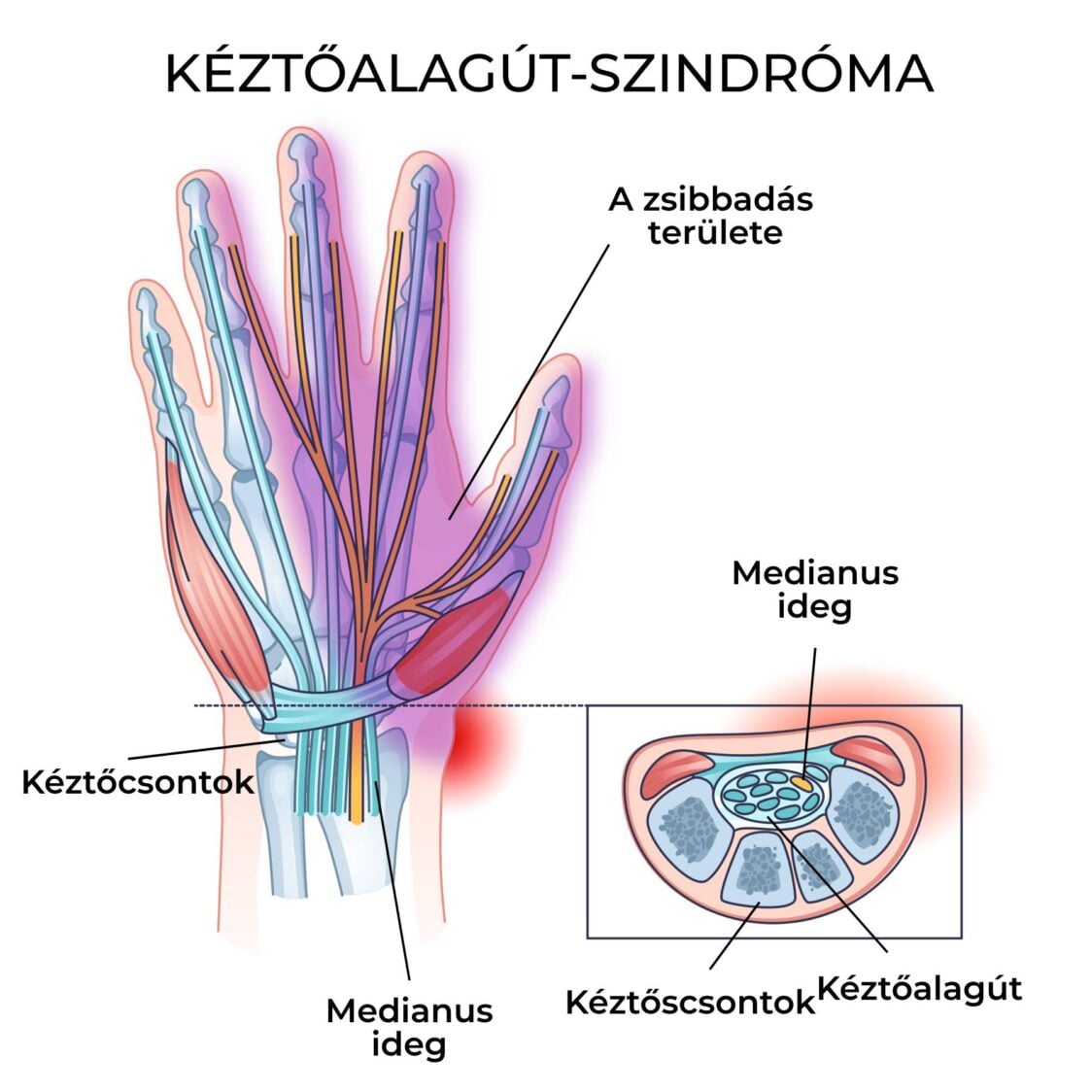Meglephet, de mindenki rendelkezik kéztőalagúttal. Ez egy keskeny alagút a csuklóban, amelyen a középideg (nervus medianus), valamint az ujjak mozgásáért felelős inak haladnak át. A gond akkor következik be, ha ezek az inak megduzzadnak, és nyomást helyeznek a középidegre. Ez a nyomás okozhatja az ujjak zsibbadását, bizsergését vagy fájdalmát. A kéztőalagút-szindróma (carpal tunnel syndrome – CTS) diagnózisának megállapításához az orvosnak speciális teszteket kell elvégeznie.