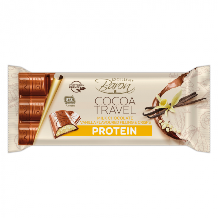 A Cocoa Travel fehérjés tejcsokoládé az egészséges finomságok rajongóinak kedvence lesz. Tele van ropogós töltelékkel, az íze pedig egyszerűen mennyei. Emellett bővelkedik az izmok növekedéséért és fenntartásáért felelős fehérjében és segít megőrizni a csontok egészségét.