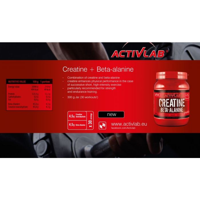 A Creatine Beta Alanine, kombinálja a kreatint és a béta-alanint, ami növeli a teljes edzési hatékonyságot az intenzív fizikai aktivitás során. Egy adagban 3 g kreatin-monohidrátot és 3 g béta-alanint tartalmaz. A kreatin növeli az intenzív fizikai állóképességet, míg a béta alanin meghosszabbítja az edzési folyamatot az izomfáradtság beálltának a késleltetése által. A készítmény különösen megfelel az izomtömeg kiépítésének az időszakára, valamint azon személyeknek, akik harci -és állóképességi sportokat űznek, mint pl. a futás, crossfit, vagy a kerékpározás.