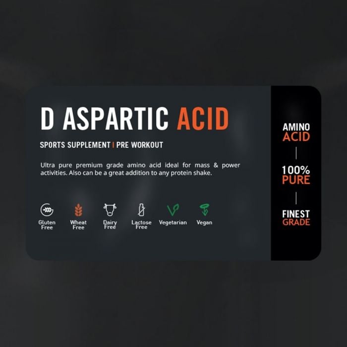 A D-Aszparaginsav 100% -os tisztaságú D-aszparaginsav (DAA) forrás, por formájában. Ez egy nem esszenciális aminosav, amely gyakran része a különböző étrendkiegészítőknek, hogy támogassa a tesztoszteron termelést és növelje az erőt. A DAA-t a tesztoszteron szintézis szabályozójának tartják, és ez a hormon fontos a férfiak számára, mert amellett, hogy a szexuális aktivitásra és a termékenységre is hatást gyakorol, az izomtömeg-növelés érdekében is fontos szerepet tölt be. A D-Aszparaginsavat vegetáriánusok és vegánok is használhatják..