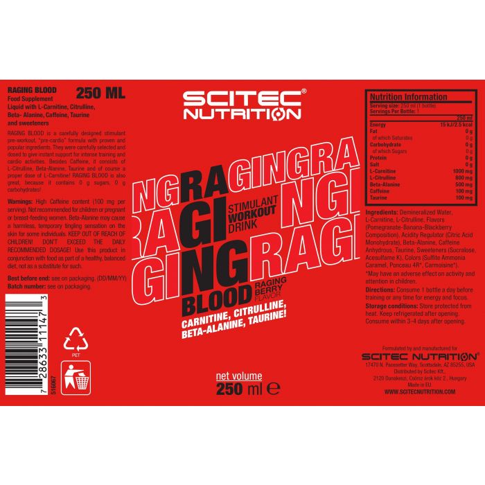 A Raging Blood RTD egy edzés előtti stimuláns RTD (ready to drink) ital formájában, bizonyított és népszerű hatóanyagokkal. Ezek gondosan úgy lettek kiválasztva és adagolva, hogy azonnali támogatást nyújtsanak az intenzív edzéshez, kardióhoz. A koffein mellett tartalmaz L-citrullint, béta-alanint, taurint és természetesen megfelelő adag L-karnitint is. Az említett L-citrullin még jobb nitrogén-oxid fokozó, nagyszerűen növeli a vérben az arginint és az ornitint is. A megnövekedett nitrogén-oxid fokozza az oxigén és tápanyag szállítást a dolgozó izmokhoz. A Raging Blood azért is nagyszerű termék, mert 0 gramm cukrot, 0 gramm szénhidrátot tartalmaz.