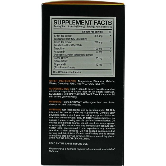 Az Enigma egy egyedülálló készítmény, amely segít minden határ legyőzésében! Az egyedülálló összetevők a legjobb megoldást nyújtják minden fizikailag aktív ember számára. Kiváló a test erősítésére, gondoskodik a következő edzés megfelelő felkészültségéről. Megerősíti az izomtömeg szintézisét, óvja a katabolizmust, növeli erőnket és kitartásunkat. Lehetővé teszi számunkra a még jobb eredmények elérését! A zöldtea kivonat biztosítja a hatékony zsírégetést és jobb antioxidáns védelemet, a további összetevők pedig hozzájárulnak a tápanyagok hatékony felszívódásához, a regenerációs folyamatok javulásához és a jelentősen alacsonyabb fáradság érzetéhez.