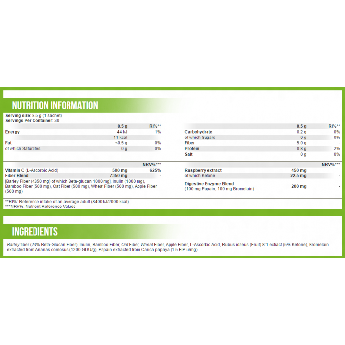 A Fibers & Enzymes Rx termék béta-glükánnal, egy rostokat, málna-ketonokat, C-vitamint és emésztő enzimeket tartalmazó italpor. A rostok nagyon fontos makró-tápanyagnak számítanak, amelyekből az anyagcsere egészséges működéséhez napi 20-30 g-ot szükséges felvenni. Sajnos az emberek nagy részénél a rostfelvétel nem éri el a szükséges mennyiséget, ami számos emésztési problémát okozhat. Egy adag Fibers & Enzymes Rx hozzáadásával a kedvenc italodhoz (ami lehet a proteinital is) könnyen 5 g rosthoz juthatsz, mégpedig 6 különböző forrásból is (alma, bambusz, árpa, zab, búza, inulin szár).