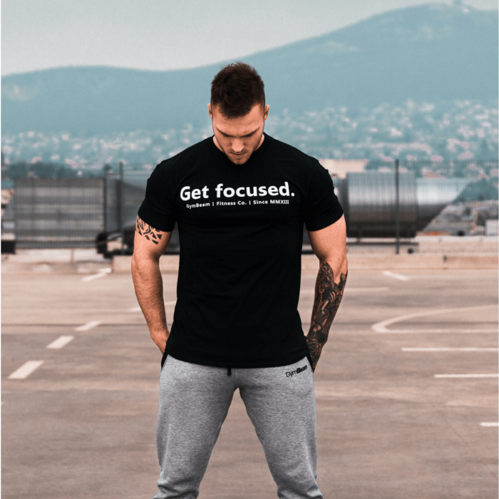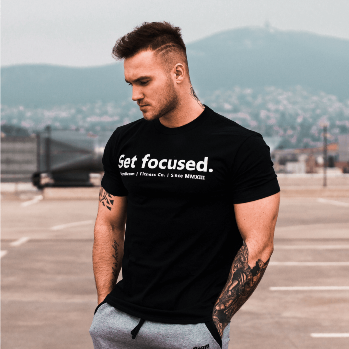 A rövid ujjú, fekete színű Get Focused póló minden sportolón, testépítőn és erőemelőn jól áll. Vállban és az ujjain tökéletesen testhezálló, így jól láthatóak benne a kemény munkával kidolgozott izmok. Összpontosíts te is a haladásra ezzel a pólóval, mely kiváló szolgálatot nyújt az edzőteremben, de a mindennapok során is.