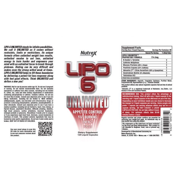 LIPO-6 UNLIMITED SZABADALMAZTATOTT FORMULA N-Acetil L-Tirozin, Caffeine Anhydrous, Paullinia Cupana (22 % Caffeine), Advantra Z Citrus Aurantium, Aframomum melegueta 774,5 mg