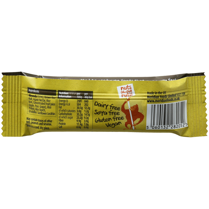 Az Almond Bar egy kitűnő, mandulavajból és természetes alapanyagokból készült rúd, amelynek köszönhetően magas növényi fehérjéket tartalmaz, ráadásul finomított cukrok nélkül. Nem tartalamaz glutént, szóját, sem pálmaolajat, alkalmas vegetáriánusok és vegánok számára.