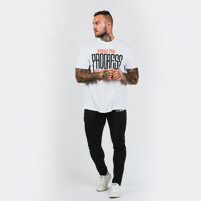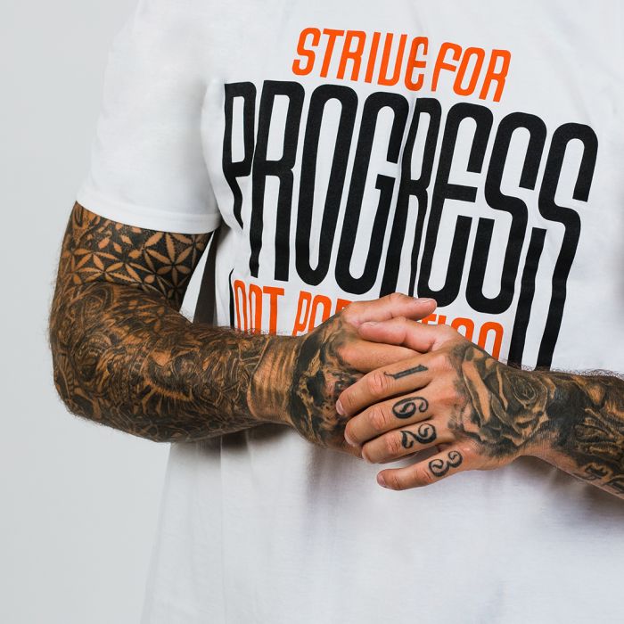 A Progress White póló nem hiányozhat egy sportoló ruhatárából sem, aki a haladásért edz, és nem a tökéletességért. Pamutból készült, ezért örömmel viseled majd a hétköznapok során is, valamint edzéseken.