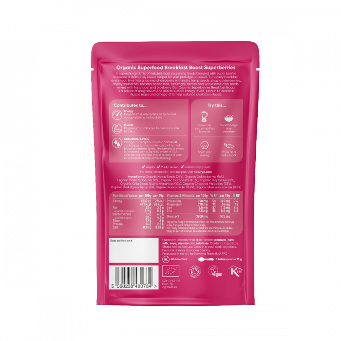 A Superfood Breakfast Boost Superberries kivételesen gazdag fehérjében, rostban, omega-3 zsírsavakban és ásványi anyagokban. Kizárólag bio összetevőket tartalmaz, beleértve a fizalist, goji bogyót, kendert, chiamagot és fehér epret.