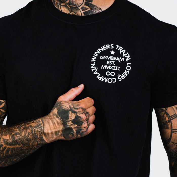 A Winners Train Black egy fitness póló 100% pamutból, laza szabással, amely minden testalkaton jól áll. Modern dizájnját a "Winners train, losers complain" felirat egészíti ki, amely a rendszeres edzésre és fitness céljaitok elérésére ösztönöz.