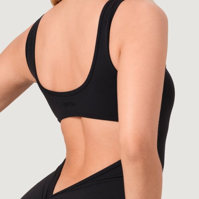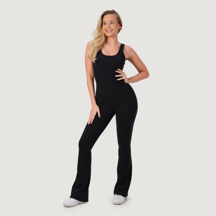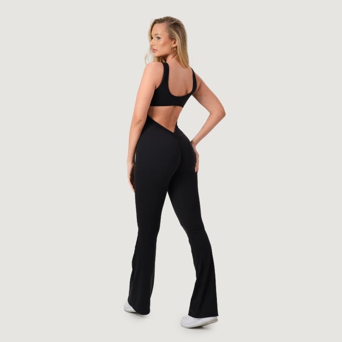 Ez a sportos, nem átlátszó, ujjatlan overál kerek nyakkivágással és karcsúsított (slim fit) szabással rendelkezik, amely tökéletesen simul az alakodhoz. A népszerű szélesedő szárú kialakítása optikailag nyújtja a lábakat, míg a hátul található húzott fenékvarrás gyönyörűen formálja és kiemeli a fenék idomait. Az elülső varrás hiánya garantálja a maximális kényelmet, megakadályozva a kellemetlen bevágást.