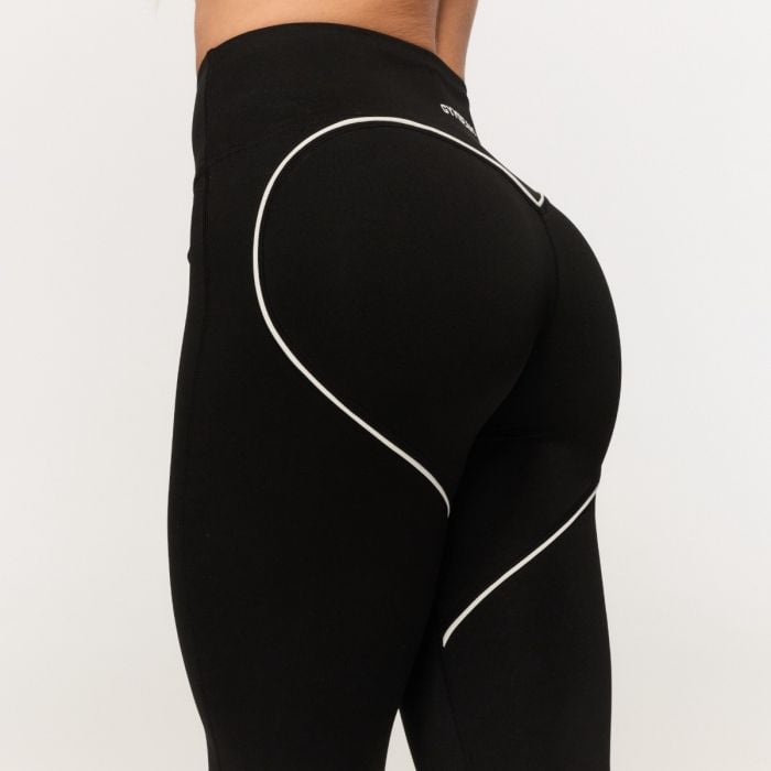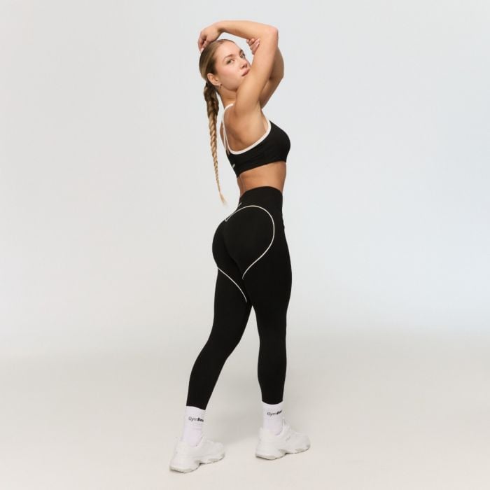 Ez a sport alapdarab hosszú szabású, amely tökéletesen alkalmazkodik az alakodhoz. A magas derék biztosítja, hogy a leggings biztonságosan a helyén maradjon, és ne csússzon le a még mély guggolások során se. Az elülső varrásmentes, zsebek nélküli kialakítás maximális kényelmet biztosít anélkül, hogy kényelmetlen nyomást vagy dörzsölést okozna. A kiemelkedő jellemzője, a nagy és kontrasztos szív alakú szegély a hátoldalon, amely vékony fehér csíkokból áll. Ez a részlet optikailag formálja a hátsó részt, és tökéletesen hangsúlyozza természetes idomaidat.