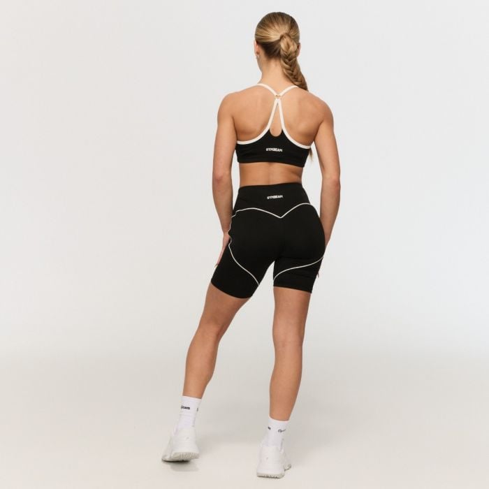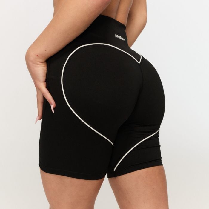 Ez a sport rövidnadrág karcsúsított, középhosszú szabással rendelkezik, amely tökéletesen illeszkedik az alakodhoz. A magas derék rugalmas pánttal biztosítja, hogy minden a helyén maradjon, míg az elülső rész varrásmentes kialakítása maximális kényelmet nyújt. A kiemelkedő jellemzője a nagy, kontrasztos szív alakú szegély a háton, amely vékony fehér csíkokból áll a trendi megjelenésért. Ez a részlet optikailag formálja az alakodat, kiemeli az íveidet, és tökéletesen hangsúlyozza nőies alakodat és vonzerődet.